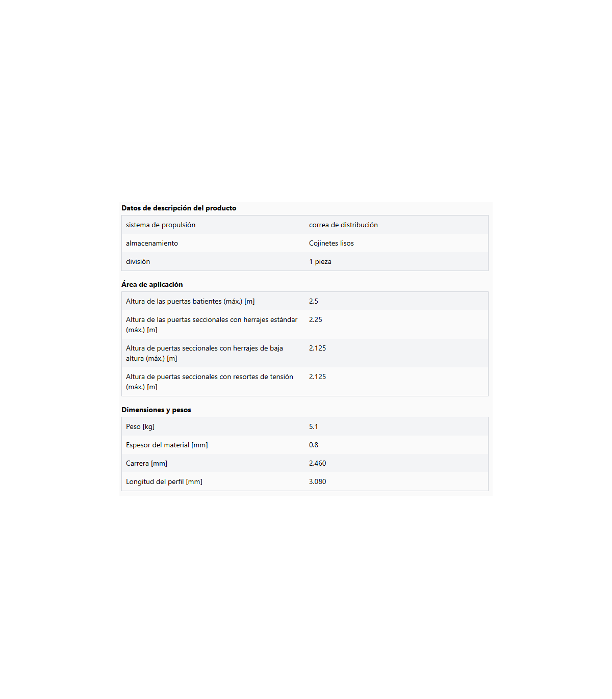 Riel de accionamiento para puertas de garaje, longitud de perfil de 3,08 m, grosor de 0,8 mm, correa dentada, 1 pieza. Para Comfort 260 (accu/speed), 270 (speed), 280, 360, 370 y 380.