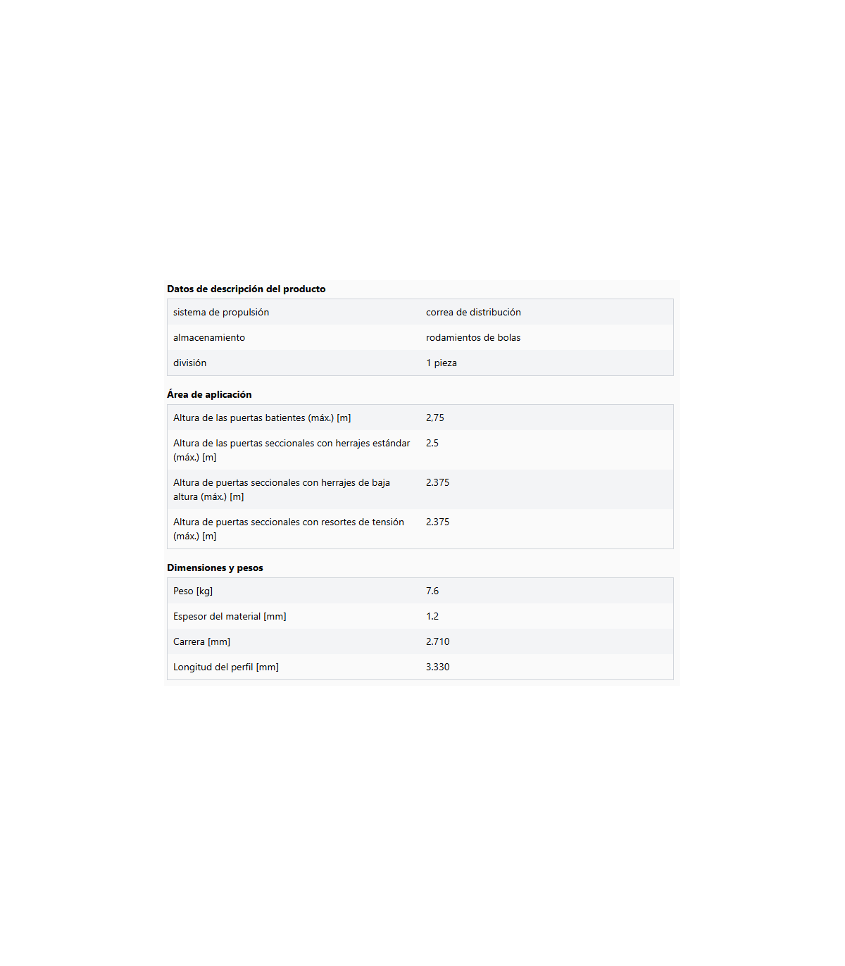 Riel de accionamiento para puertas de garaje, longitud de perfil de 3,33 m, grosor de 1,2 mm, rodamiento de bolas, correa dentada, 1 pieza. Para Comfort 260 (accu/speed), 270 (speed), 280, 360, 370, 380 y 390 (plus).