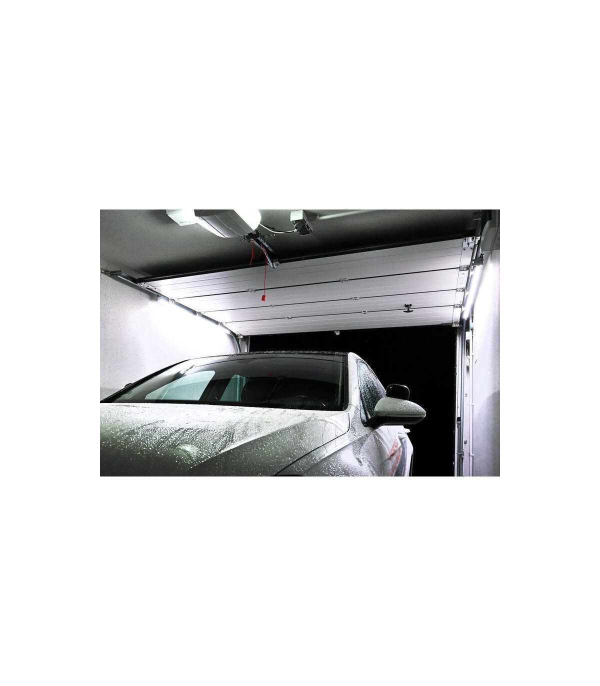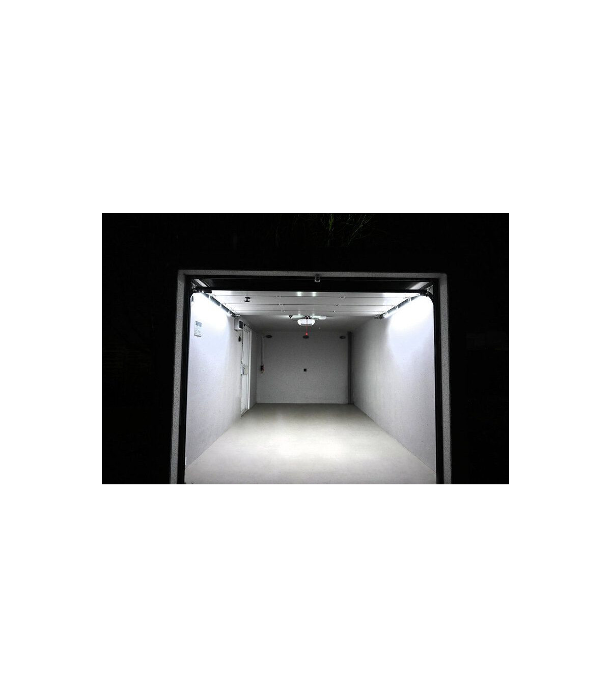 Sistema de iluminación LED para garajes, compuesto por dos tiras LED magnéticas de 1,5 m de longitud cada una, con unidad de conexión de 230 V CA y sensor de movimiento/luz natural integrado. Para puertas de garaje basculantes, abatibles y seccionales.