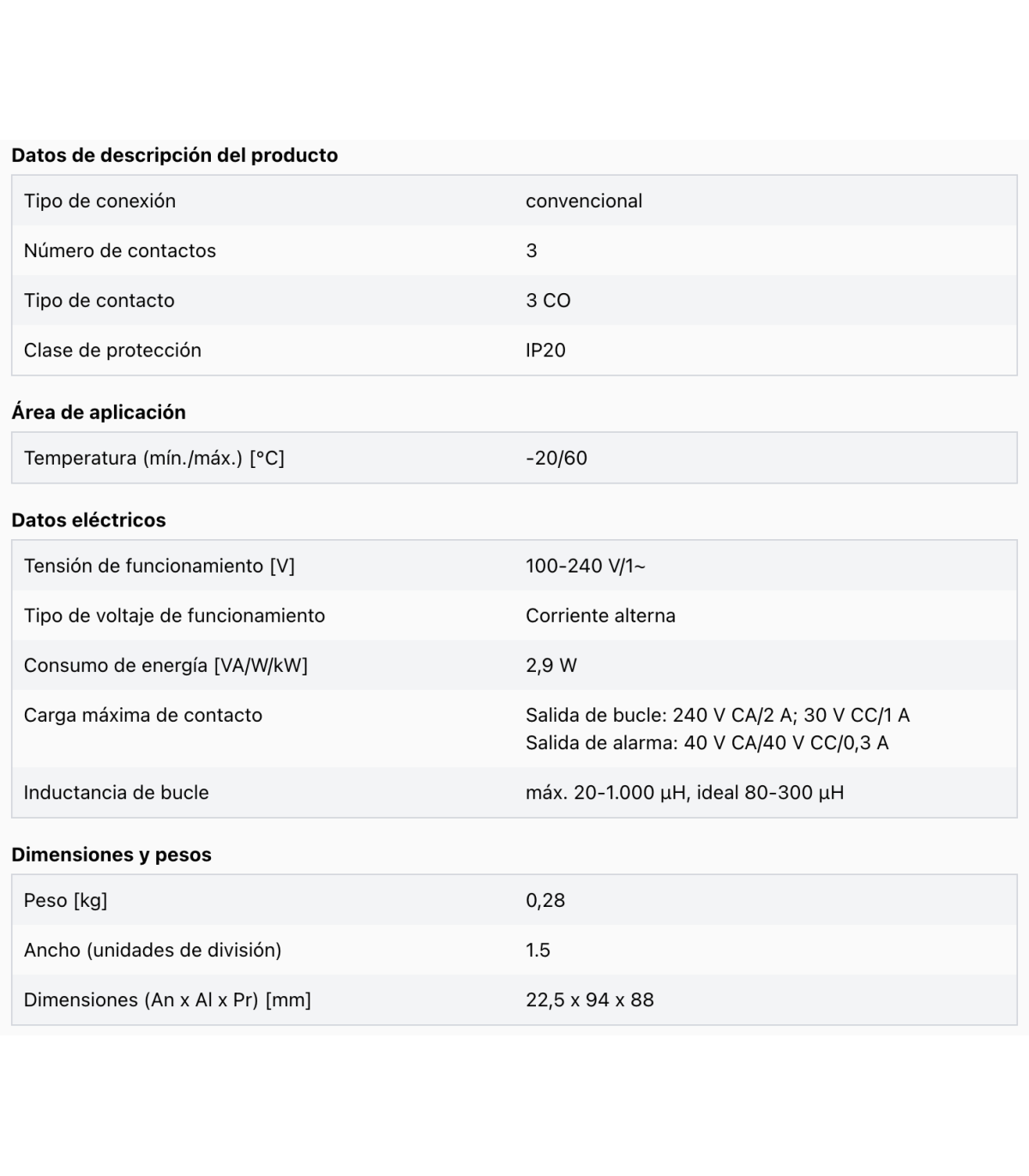 Detector de bucle de inducción, 2 canales, 230 V CA, montaje en carril DIN.