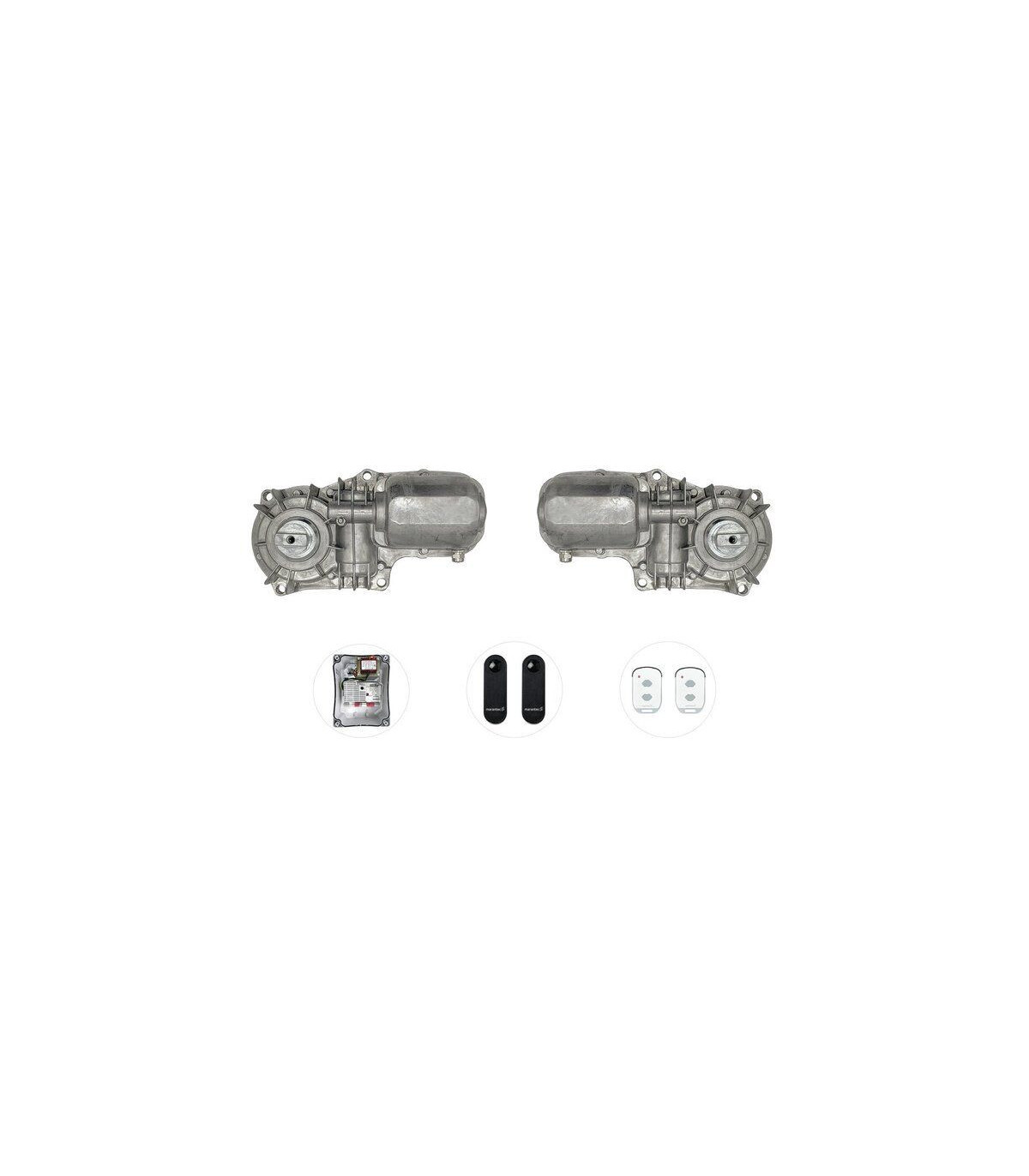 Kit para puertas batientes de 2 hojas hasta 3,0 m, 868 MHz bidireccional: motor 24 V-DC, 1.500 N, 2,6 cm/s, 120°, sin encoder.