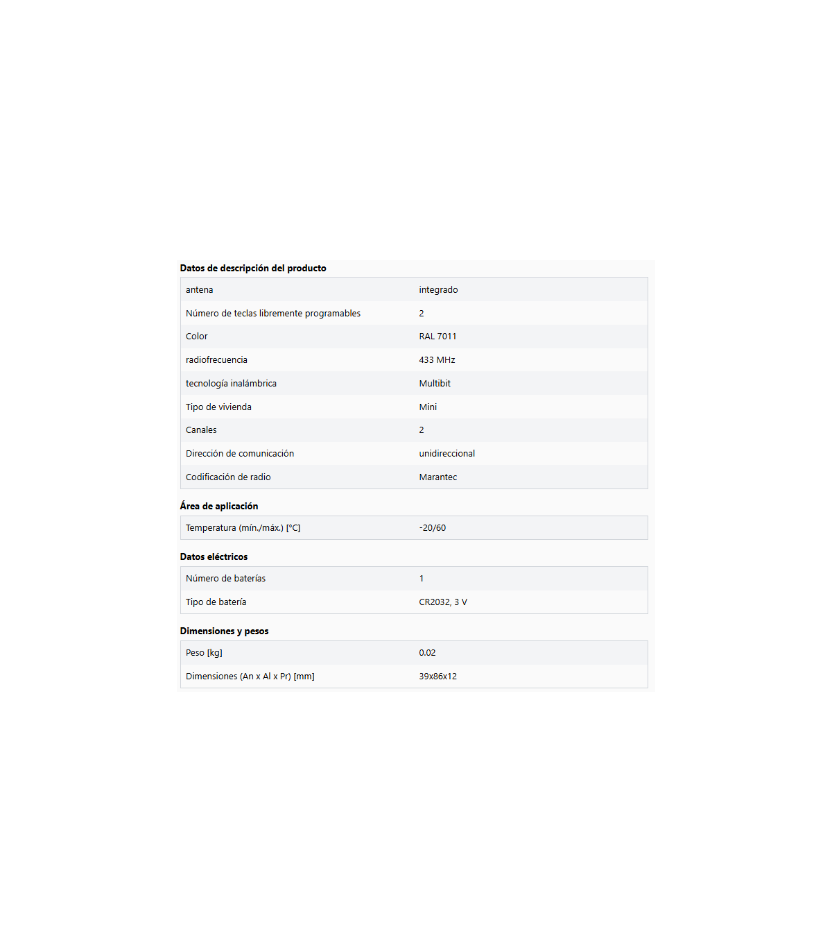 Minitransmisor portátil de 2 canales, unidireccional, multibit de 433 MHz. Compatible con todos los controladores Marantec y productos de terceros (en combinación con un receptor multibit adecuado).