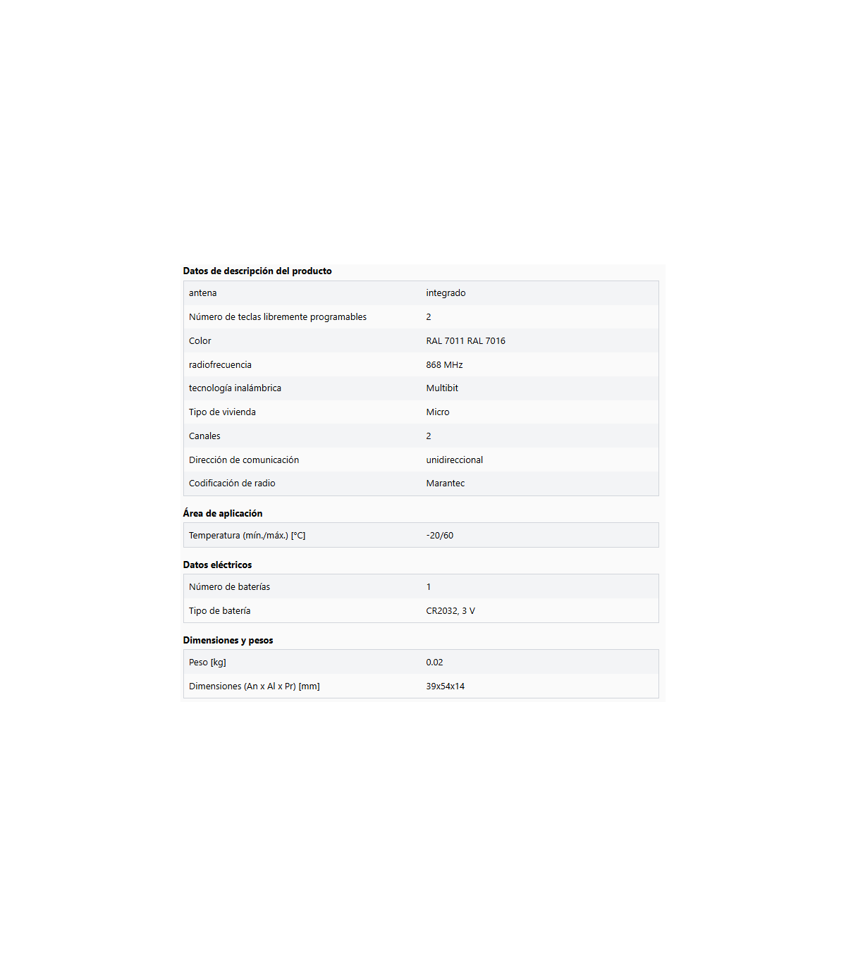 Microtransmisor portátil de 2 canales, unidireccional, multibit de 868 MHz. Compatible con todos los controladores Marantec y productos de terceros (en combinación con un receptor multibit adecuado).